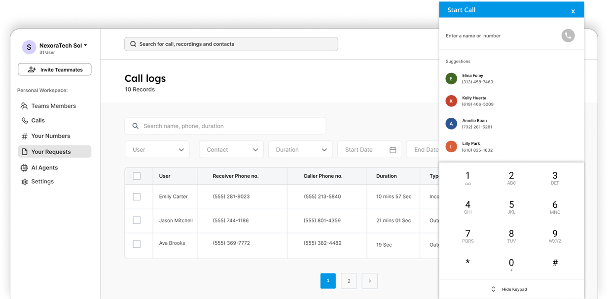 Whether managing a small team or a large call center, the dashboard scales to meet your needs, supporting multiple extensions and numbers.